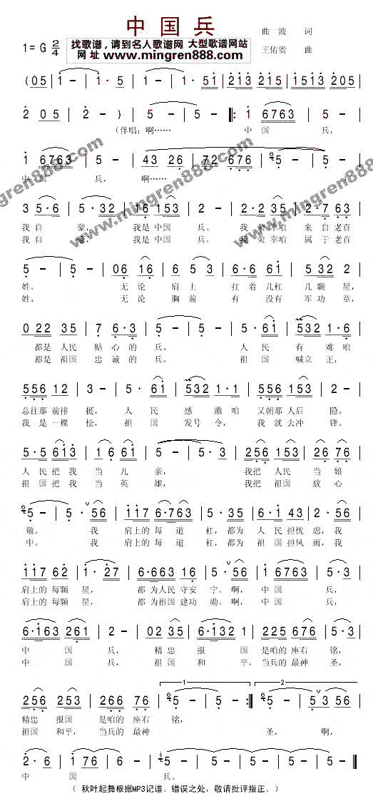 我自豪,我是中国兵,我荣幸,咱来自老百姓。无论肩上抗着几杠几颗星,都是人民贴心的兵。人民有难咱总是往前挺,人民感激咱又朝那人后隐。人民把我当儿亲,我把人民当娘敬。我肩上每道杠,都为人民担忧虑,我肩上每颗星,都为人民守安宁。啊,中国兵、中国兵,精忠报国是咱的座右铭,精忠报国是咱的座右铭。 我自豪,我是中国兵,我荣幸,咱属于老百姓。无论胸前有没有军功章,都是祖国忠诚的兵。祖国喊立正,我是一棵松,祖国发号令,我就去冲锋。祖国把我当英雄,我把祖国放心中。我肩上每道杠,都为祖国担风雨,我肩上每颗星,都为祖国建功勋。啊,中国兵、中国兵,祖国和平,当兵的最神圣,祖国和平,当兵的最神圣。啊,中国兵! |