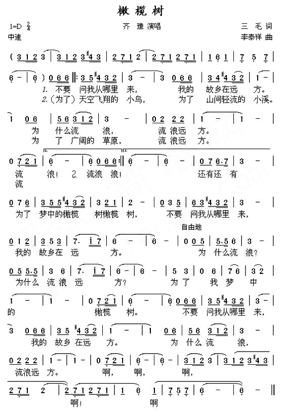 经典老歌简谱系列之《橄榄树》!此曲由三毛填词,李泰祥作曲,齐豫演唱!