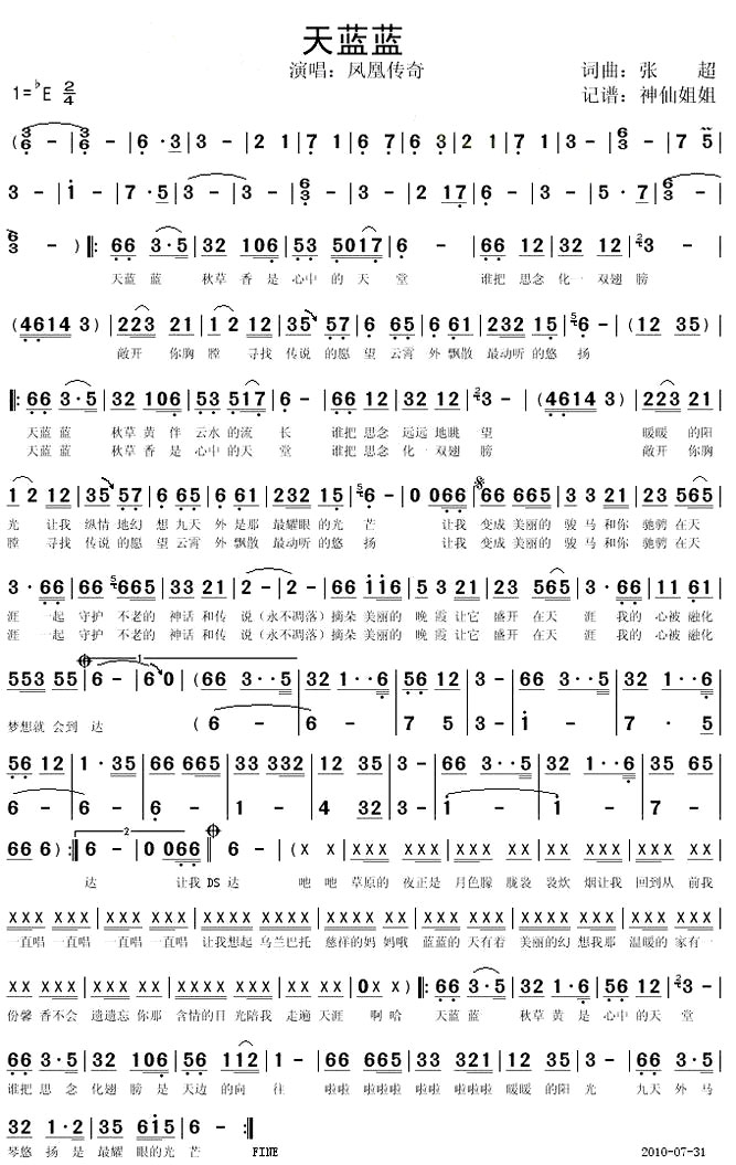 《天蓝蓝》凤凰传奇演唱歌曲,张超填词作曲,收录在专辑《最炫民族风》中。这首歌曲融合了说唱和R&B,歌中为我们描绘出了一副云淡风轻的写意山水画,是一首弘扬环保精神的歌曲。这首歌也体现出凤凰传奇的“绿色自然主义”。歌中借男女在美丽草原上的爱情故事来提示我们要保护大自然。