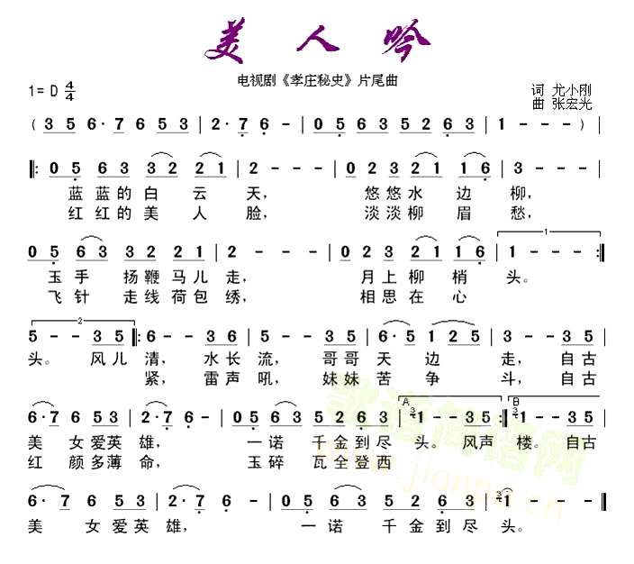 美人吟歌词 作词:尤小刚 作曲:张宏光 演唱:李玲玉 蓝蓝的白云天 悠悠水边流 玉手扬鞭马儿走 月上柳梢头 红红的美人脸 淡淡柳眉愁 飞针走线荷包绣 相思在心头 风儿清 水长流 哥哥天边走 自古美女爱英雄 一诺千金到尽头 风声紧 雷声吼 妹妹苦争斗 自古红颜多薄命 玉碎瓦全登西楼