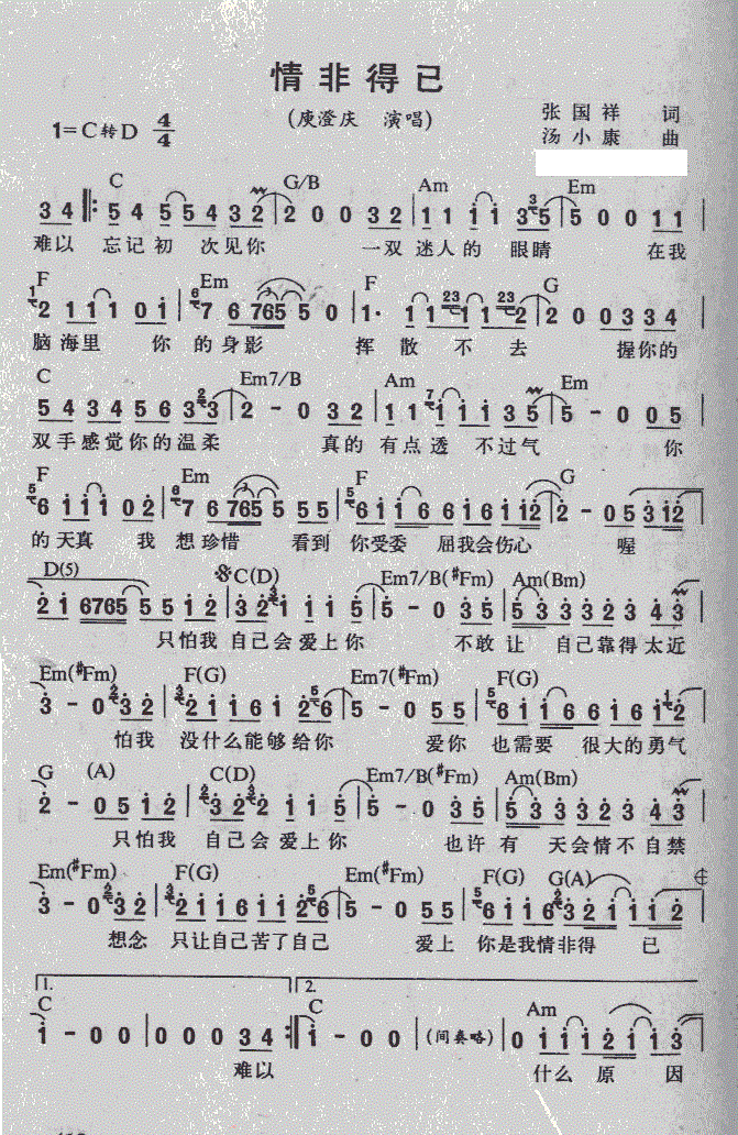 由汤小康作曲,张国祥作词的这首《情非得已》,经由庾澄庆的独特演绎,受到无数歌迷的喜爱。它的创作秉承了新谣的优良传统,在华人最为喜欢的流畅旋律线下,又不乏精致民谣的腔调。不像纯西洋歌曲那样欧陆情怀,也不像有些华语流行曲那样的土气。