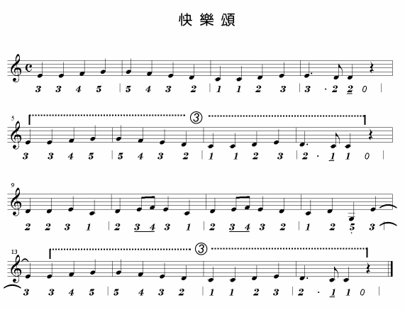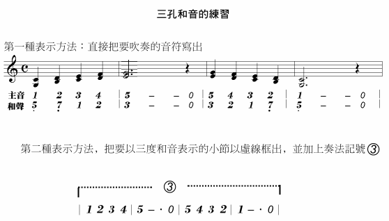 四、保持三孔的嘴型不变吹奏其他音阶,以右嘴角的音当成主音,并细心聆听这两音的和声。