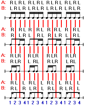 以16分音符为基础的打点里,有4种最基本的变化类型(如上图所示)。如以四连音(节奏1.)当作基本结构去分析的话(1234),首先必须注意其它三个节奏类型与四连音的对应关系及位置(如红线所示)。这样一来,便可以很清楚地了解打点的关系位置所在而能较精准的打出正确的节奏来。 练习时,先从四连音开始下手。先练A的手法再练B的手法。一直到可以顺畅平稳的打出四连音之后,再继续其他的类型节奏。练习其他的节奏类型时,可以先用1234的数字概念唱出四连音作为基准地去打出每个节奏类型的正确位置。一样的先练A手法再练B手法。(2.3.4.节奏类型A手法的衍生也是以四连音为基础的相对应位置而来的)。等到四个节奏类型的位置手法都搞清楚之后呢!再以排列组合的方式,先以两个节奏为一组,4/4拍为小节反复的交替练习。之后再三个节奏一组。最后再以四个节奏一起的排列组合方式,随心所欲的交换先后顺序练习。只要这四个节奏类型能练到如反射动作般的打出正确的手法和节奏的时候,相信往后在你遇到更复杂的节奏类型时!!都可以运用相同的练习方法及模式去解决你所遭遇的问题。因为音符之间的关系不外乎就是最基本的数学关系的运用计算而已。还是别忘了用节拍器且从最慢的速度开始练起!!