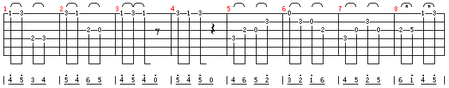 第八小节是滑音,滑音第一个音的左手指按好,右手拨出,然后不离开指板滑向下个音位,下行同样由第一个音滑向第二个音,也不离开指板。