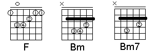 怎么这的F和弦和以前的不一样。你自己去推算一下音,五弦上空弦是A音,三品是C音都是F和弦的组成音。学会了大横按F和弦再弹《烟火》就不难了。Bm7是属7和弦,其组成音是5724。