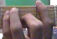 要从食指中寻找每根弦在手指上的感觉。食指应稍稍往回弯一点,这样可以将弦按实。要避开食指指节的接缝处,那样的话你永远发不了音。