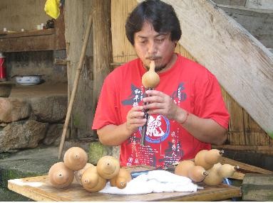 葫芦丝由气斗(葫芦),一至三管音管(黄竹或紫竹)和簧片(铜制)组成。把一至三根带簧片的竹管从上面(带金属簧片的部分)排插入葫芦底端。主管(中间的管)开七个按音孔(前六后一),短副管和长副管不开音孔,只发持续单音。不需副管发音时,可将其堵住。葫芦有两种功能:一是保护簧片,二是做气囊,存贮气流。簧片的功能是发音,呈锐三角形。傣语称主管为“咩(母亲)筚”,副管为“暗(小孩)筚”,吹口为“索(嘴)筚”,簧片为“另(舌头)筚”,其名称生动形象。