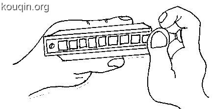 对于半音阶口琴有了基本的认识之后,接下来做进一步的技巧研习,首先是握琴姿势和按键: 握琴时琴孔朝向自己,按键在右方,以左手食指及拇指加紧琴身,右手则以食指的第一关节下方靠于按键上,而由拇指与中指夹住口琴(如图所示)。右手握法的主要用意是使按键不易脱离手指,并且让手指的移动距离减到最低,以避免按键次数过多,而产生疲累或迟缓的现象。当然,握琴的方法与按键的运用手法是随个人喜好而定的,只要拿的舒适并且在不妨碍吹奏的原则下,任何方法都是可以的。至于以上所提的方法,只是个人吹奏半音阶口琴数年来所一直采用,且效果不错的方法,在此提出,仅供参考。
