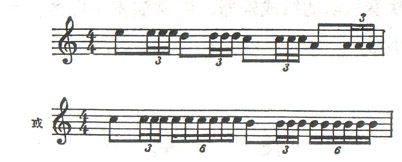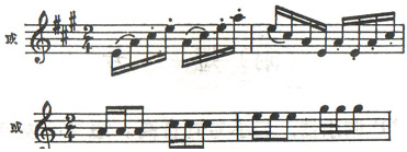 双吐法速度可达到d=126—140连续的十六分音符。这种方法,最宜于演奏下列音型: