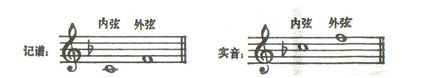 内弦为C。,外弦为f2。两弦之间音高相距纯四度。一般演奏者惯用首调概念定弦。