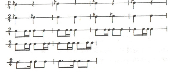 演奏时将鼓身斜挂在肩上(间或将鼓直立于地),双手拍鼓。有正拍、闷拍、指拍(用一个指头)以及拳击等手法,在演奏的高潮或情绪热烈时,甚至手肘和脚也参加击鼓。常用的传统节奏型如下: