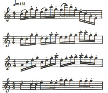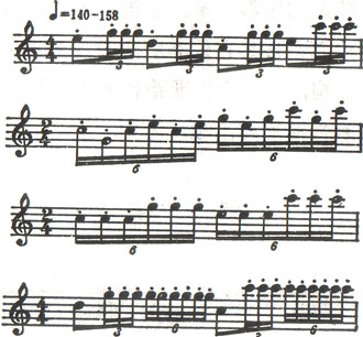 三吐法是单吐与双吐的结合,适宜于演奏.连的十六分音符。要求这些音型较有规律。如: