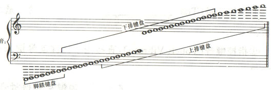 下排键盘多用于演奏对位声部或伴奏织体,一般由左手演奏(必要时亦可双手同时演奏)。