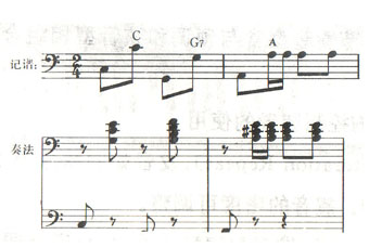 自动打击乐节奏音型常与预调和弦音型相组合,多用于电子琴独奏。