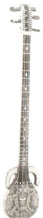 球形,木质,蒙以蟒皮,张五根金属弦,多个音品(改革的热瓦普音品可多至二十个)。用高音谱表记