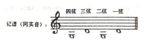 四胡以一、三两弦为外弦,二、四两弦为内弦。外弦定为d1;内弦定为g。两组弦之间音高相距为纯五度。
