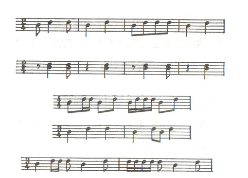 纳格拉用两根鼓槌敲击。可以单打、双打或滚奏,亦可运用鼓中心击、中圈击、外圈击、鼓帮击、闷击等奏法,以求得音色的变化。两鼓可交替或同时演奏。纳格拉常用的节奏如下;