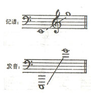 低音提琴独奏时,如必要也可用中音谱表或高音谱表记谱。