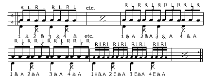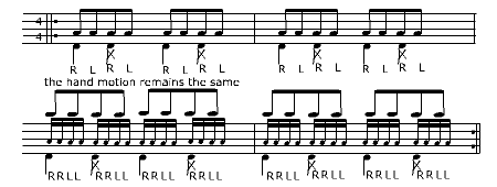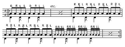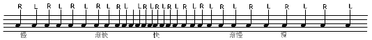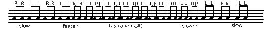 开始时要慢,然后逐渐加快到你最快的速度,按这个速度继续演奏几秒钟后,逐渐减慢到起始速度。按这个方法所有的速度都练到了。在鼓槌自然回弹的同时,注意要尽量放松手腕。