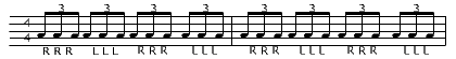 每个鼓槌要均匀的连跳三下。掌握了这种三跳滚奏之后,你对鼓槌的连跳会控制的很好了。以慢速开始,逐渐加速(可用底鼓或踩镲打拍子)。