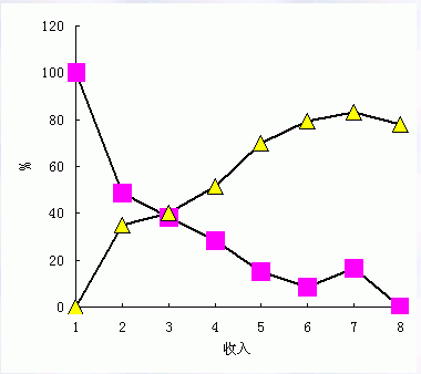 资料来源:2001《中国连锁经营统计年鉴》。 尽管现阶段超市经营生鲜的比率还较低,但它们的优势已经逐渐显示。特别是随着收入水平的提高,消费者对生鲜质量关注度正在上升,对价格敏感性逐渐下降。根据我们对北京市居民蔬菜消费的调查结果表明(图1),在买菜时,收入水平越高的消费者对菜的质量关注越高,而对价格的敏感性越低。在家庭人均月收入低于1000元时,消费者几乎只考虑价格,他们只能选择去价格低的场所购买蔬菜;而家庭人均月收入达到8000元以上的消费者几乎不关注蔬菜价格,他们追求生鲜食品高质量和购物的便利性和舒适性。当家庭人均月收入超过3000元时,消费者买菜时对质量的关注程度超过价格。 1=1000元以下;2=1001—2000元;3=2001—3000元;4=3001—4000元5=4001—5000元;6=5001—8000元;7=8001-10000;8=10000元以上。(家庭人均月收入) 注:……▲……买菜时优先考虑质量;……■……买菜时优先考虑价格 图1、不同收入消费者买菜时的考虑因素