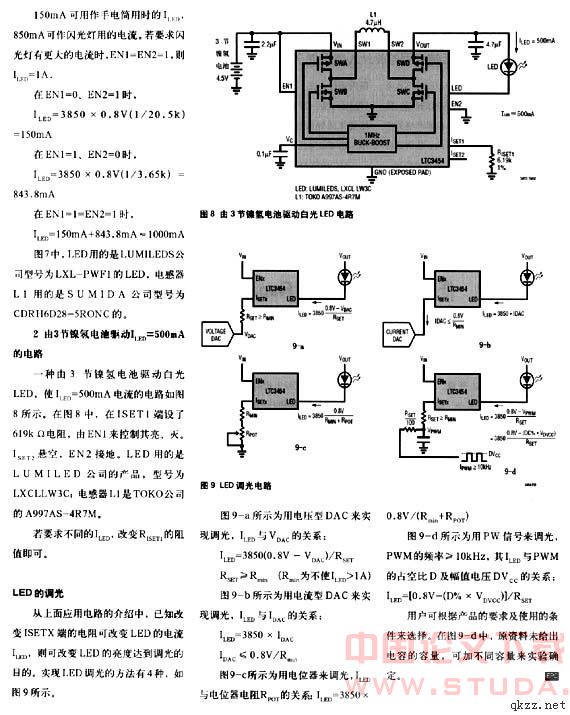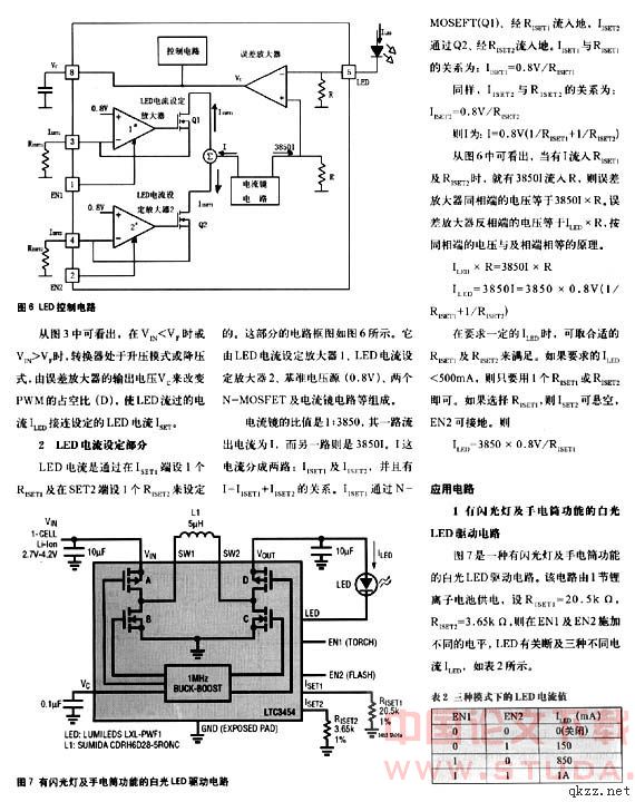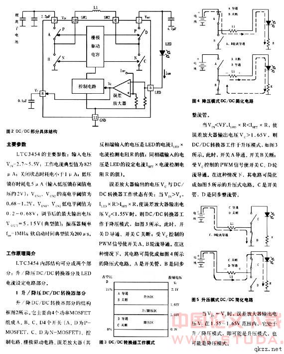 LTCM54可用1节锂离子电池(2.7~4.2V)供电,能以lA的电流驱动白光LED作闪光灯。在电池的电压VB^T大于LED的正向压降VP时,它工作于降压模式;若电池电压下降,VB^T