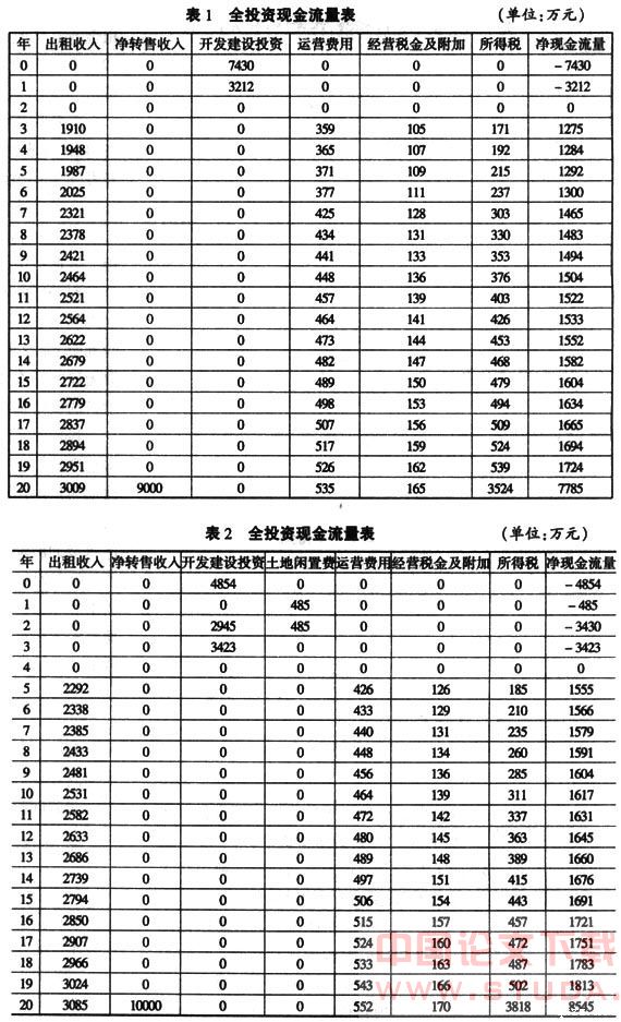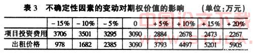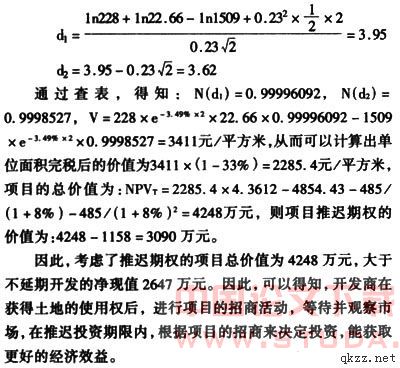 2.传统的项目投资决策分析 为了和前面的分析相对应,假设所有商铺只租不售,均通过租赁的方式来获取收益。 该项目从今年初开始,开发期为2年,其中建设期1.5年,前期工程0.5年,计划今年年末完工。预计本项目所需投资总额1.11亿元,其中包括土地费用4854.43万元、基础设施建设费(包括前期工程费)1000万元、商业用房建筑安装工程费2398.66万元、公共配套设施建设费32.5万元、管理费用248.57万元、财务费用441.12万元、销售费用1323.36万元、开发期的税费121.56万元、其他费用110.85万元、不可预见费554.27万元。假设项目当年的投资额发生在年初,项目今年的投资比重为68.8%,今年为31.2%。根据市场调查,结合本项目的实际情况,预计项目今年的租赁价格为1.5元/天·平方米,以后每1年在上1年基数的基础上递增2%;出租率今年-2012年为80%,从2013年开始为90%。运营费用包括:房产税、管理费用、修理费用、保险费等,其中房产税按年租金的12%计算,管理费按年租金的4%计算,维修费按建筑物重置价格的2%计算,保险费按建筑物重置价格的0.2%计算。项目的经营税金及附加采取的税率为5.5%,计税基础为出租收入,所得税的税率为33%,计税基础为项目每年产生的利润,为简化计算,土地增值税不计。土地使用年限为40年,预计商业地产项目在经营18年后的净转售收入为9000万元。 根据前面的分析,可以通过编制商业地产开发项目损益表,计算出商业地产项目在寿命期内各年的利润总额,从而可以计算出项目所要缴纳的所得税。最后根据上述数据,编制商业地产项目的全投资现金流量表,以此计算出项目的净现值。项目全投资现金流量表,详见表1。 考虑资金时间价值和投资者对风险的态度,风险调整贴现率取8%,从而可以得出该项目的NPV=2647万元,则该项目经济上可行,可进行投资。 3. 基于实物期权方法的投资决策分析 下面运用实物期权法重新审视该项目。假设市场走势难以确定,可以延期投资,并以推迟2年为例进行分析。项目的开发期为2年,预计今年开始施工,2010年末竣工并交付使用,项目从2011年开始获取收益,预计项目的租赁价格为1.6元/天·平方米,以后每1年在上1年基数的基础上递增2%;出租率为90%,每年的土地闲置费用为土地出让价的10%。 参照前面介绍的项目相关数据,开发商要想获得此推迟期权,首先必须获得土地的使用权,其中土地使用费用为4854.43万元。无风险利率采用今年发行的凭证式(一期)国债5年期的票面年利率3.49%,考虑土地负的红利分配,设其等于无风险利率。项目的开发建设投资(不包含土地使用费用)预计在原来的基础上增加10%,即为4854.43+(11085.3-4854.43)×1.1=11708.4万元,项目的总投资为:11708.4+4854.43×(10%+10%)=12679.29万元。考虑商业地产项目推迟开发的全投资现金流量表,详见表2。考虑资金时间价值和投资者对风险的态度,风险调整贴现率取8%,可以得出NPV=1158万元。 租赁价格波动率,采用该市中房指数典型地产指数今年8月至今年1月的数据进行计算,得出租赁价格的波动率为0.23。 下面具体对项目的推迟期权进行计算。根据市场调查,目前,该市同类商业地产的租赁价格均价为1元/天·平方米,因此推迟期权初期的租赁价格取值为365元/年·平方米,即毛租金收益为365元/年·平方米。其中运营费用的计算依据是:管理费按年租金的4%计算,应交税金按年租金的12%计算,维修费按建筑物重置价格的2%计算,保险费按建筑物重置价格的0.2%计算,经营税金及附加按年租金的5.5%计算,则净租金收益为:365-365×(4%+12%+5.5%)-2431.16×1.1(2%+0.2%)=228元/年·平方米,商业地产项目开发单位面积的付现成本(不包括土地费用)为1509元/平方米,W=22.66。 则: 因此,考虑了推迟期权的项目总价值为4248万元,大于不延期开发的净现值2647万元。因此,可以得知,开发商在获得土地的使用权后,进行项目的招商活动,等待并观察市场,在推迟投资期限内,根据项目的招商来决定投资,能获取更好的经济效益。 4.实物期权价值的敏感性分析 这里主要分析项目投资费用、波动率和出租价格的变化对项目期权价值的影响。假设项目投资费用和出租价格的变化率分别为+5%、+10%、+15%、-5%、-10%。不确定性因素的变动对期权价值的影响情况,见表3。 假设出租价格波动率分别为0.1、0.2、0.3、0.4、0.5、0.6、0.7、0.8、0.9、1.0,分析波动率的变动对项目期权价值的影响,具体内容见表4。 通过以上的实证分析,可以得知,使用本文构建的模型计算结果和理论分析结果是一致的。一方面表现为考虑了项目期权价值在内的项目总价值大于传统的净现值评估价值;另一方面表现为看涨期权的价格与标的资产价格、波动率大小成正向变动,与项目投资费用成反向变动。 五、结语 本文对商业地产投资特性进行分析,从中找出商业地产投资中所蕴涵的实物期权特性,并通过对B-S模型进行修正,提出商业地产推迟投资的实物期权模型,并对其进行实证,得出考虑了项目期权价值在内的项目总价值大于传统的净现值评估价值。因此,将实物期权运用于商业地产投资决策领域,是充分地考虑了开发商的决策灵活性,使项目投资决策更接近于项目实际情况,也将有助于提高投资决策的正确性。 参考文献: [1]Hayers R.H.,W.J.Abernathy.Managing Our Way to E-conomic Decline[J].Harvard Business Review,1980,58(4):67-77. [2]Hayers R.H.,D.Garvin.Managing as If Tomorrow Mat-tered[J]. Harvard Business Review,1982,60(3):70-79. [3] Black F, 