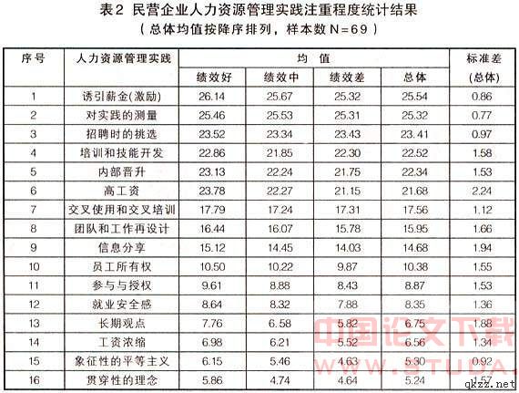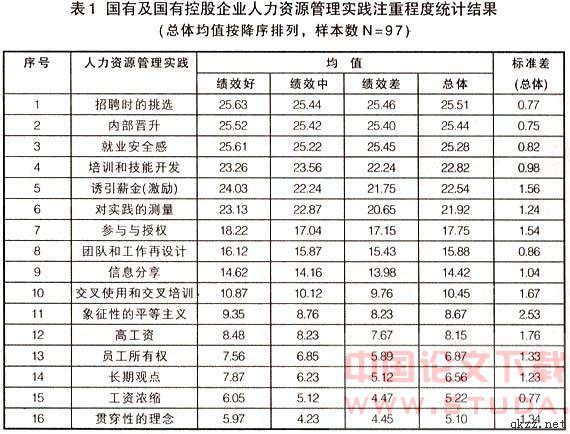 内容摘要:本文对我国西部国有及国有控股企业和民营企业的人力资源管理实践状况进行了实证分析,发现不同性质企业的人力资源管理实践的组合模式存在差别。 关键词:人力资源管理实践 组织绩效 组合模式 战略人力资源管理(SHRM)是现代人力资源管理的前沿领域, 近年来在理论界和实践界受到越来越多的关注。而确立战略人力资源管理实践与组织绩效之间的关系是研究需要解决的首要问题,《管理学术杂志(Academy of Management Journal)》和《工业关系(Industrial Relations)》以及《国际人力资源管理杂志(International Journal of Human Resource Management)》都有相关研究专刊。 许多优秀公司,如UPS、GE等的实践也证明,战略人力资源管理实践能够提高组织绩效,开发组织能力并使其最大化,进而提升组织的持续竞争优势。因此,深入研究战略人力资源管理实践或实践组合与组织绩效的关系,对于我国企业,提升国际竞争力具有十分重要的理论与现实意义。 国外相关研究综述 人力资源管理实践与组织绩效关系研究始于20世纪90年代末,深受人力资源管理普遍性理论的影响,主要研究内容有三方面:影响组织绩效的因素研究、对人力资源管理实践是否是影响组织绩效最重要因素假设的验证、是否存在与组织最优绩效相关联的某些或一系列最佳人力资源管理实践。 研究表明,一些人力资源管理实践确定与组织绩效有更大相关。但是批评者认为,能为企业创造持续竞争优势的是人力资源管理系统,而不是某些单个的人力资源管理实践,因为单个实践容易复制,系统化的人力资源管理实践具有特质化、复杂性、难以模仿和路径依赖的特点。 不少学者也对人力资源管理实践与组织绩效关系进行了大量的实证研究。Leverin和Moskowitz (1993)调查了美国100家最好的企业,Lawleretal (1995)调查了《财富》杂志上的1000家企业,均发现员工参与和全面质量管理的运用导致更显著的投资回报。当这些实践作为一个系统来实施时,这些影响是最明确的,它将使相互补充的人力资源实践活动联合成为一个内部一致的系统,并直接与价值创造相关联。 Ivhniowskietal(1997)和Berg(1999)研究了钢铁行业高绩效工作系统中的人力资源管理实践,发现更创新的实践活动与更高的生产率相关联。在对制造型企业研究后,Appelbaumetal (2000)发现,高绩效工作系统中的人力资源管理实践运用与更高的股票市场价值以及劳动生产率相关联。Paauwe和Richardson(1997)总结了以往实证研究的结果后提出了一个研究框架,他们认为,人力资源管理实践会影响人力资源绩效,而人力资源绩效又会进一步影响企业与财务相关的绩效,有些实践还会直接影响企业的财务绩效。 样本企业人力资源管理对组织绩效的影响 本文研究假设 在我国改革开放的社会变革中,形成了许多不同性质的企业类型,这些企业中除有少数业绩优良的企业之外,还包括着大量业绩一般或较差的企业。那么,不同性质的企业是否采取不同的人力资源管理实践组合模式从而影响组织的绩效呢? 因此,本文的假设是:同一地区和时期内,企业性质相同的人力资源管理实践组合基本一致;即企业性质相同,但组织绩效不同的企业人力资源管理实践注重程度(即实践排序)基本一致。 样本数据调查与处理 从今年下半年起,笔者对四川省82家企业的人力资源管理实践情况进行了调查。其中,国有及国有控股企业46家,占56%;民营企业36家,占44%。被调查企业主要涉及机械、电子、化工、烟草、食品、医药及房地产企业。在46家国有及国有控股企业中,组织绩效好的企业为12家,绩效居中的企业为20家,绩效差的企业为14家;在36家民营企业中,组织绩效好的企业为11家,绩效居中的企业为16家,绩效差的企业为9家。需要说明的是,组织绩效是由企业的销售收入及其增长率、利税总额及其增长率等财务指标来综合衡量。 在本文所涉及的样本企业里,所谓组织绩效好是指企业的业绩在近3年全省行业的排名中处于前20名,所谓组织绩效差是指企业的业绩在近3年全省行业的排名中处于后30名,所谓组织绩效居中是指企业的业绩在近3年全省行业的排名中处于上述情况的两者之间。 在调查期间,共发放“企业人力资源管理实践注重程度”问卷225份,获得有效问卷166份。其中,国有及国有控股企业的有效问卷97份,民营企业的有效问卷69份。被调查的直接对象是企业人力资源部经理、主管以及总经理。 笔者以Pfeffer(1994)列举的16种人力资源管理实践,即就业安全感、招聘时的挑选、高工资、诱引薪金(激励)、雇员所有权、信息分享、员工参与与授权、团队和工作再设计、培训和技能开发、交叉使用和交叉培训、象征性的平等主义、工资浓缩、内部晋升、长期观点、对实践的测量、贯穿性的理念等来设计调查表。 该问卷采用对偶比较法,即对问卷表中各实践活动之间进行两两比较,若A实践比B实践重要则打2分,同样重要则打1分,不重要则打0分。完成所有的比较和打分后,再横向加总。调查对象根据自身企业目前对这些实践的使用(即注重)情况作出选择。 对于有效问卷,按照国有及国有控股企业和民营企业两个组别进行分类统计,针对每一种人力资源管理实践,先分别统计组织绩效好、中、差企业的均值,再统计总体均值及其标准差,由此得到表1和表2的结果。 本文的不足 本研究的不足之处在于:一是组织绩效以财务指标衡量