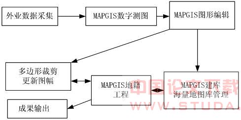 2 系统应用特色 §2.1 基础数据库建设 随着桂林市大规模的城市改造工程逐步完成,采用全数字航空摄影测量、地面数字测图、权属调查,配合GPS、GIS和网络技术,整合了一套完整的基础数据库,包括:100平方公里的地籍数据库和200平方公里的地形数据库[2,3];100平方公里的正射影像图和三维建模;9个县、1个市1:10000土地利用数据库1000 多幅;利用GPS建立了基础、首级控制网,控制网已经覆盖200多平方公里,为“数字桂林”奠定了基础。 §2.2 多源数据和多个应用系统的一体化管理 完成了城镇地籍、土地利用(详查)、建设用地、窗口办公、土地监察、综合查询等子系统的开发和应用。通过100M光纤连接城区机关大楼和服务大楼,通过VPDN/VPN虚拟专网方式连接市局和分局、县局,由接入商和市局的服务器做两次认证,并通过防火墙和外网隔离,在该网络的基础上,应用C/S模式(局域网上)和 B/S模式(广域网上)通过土地管理信息系统进一步实现窗口式限时办公、政务公开、信息发布、公开查询等功能。采用了分布式数据库管理技术,实现了市局与各分局、县局之间空间数据的分布式管理,以及行政数据的实时更新,确保了两级数据的一致性。 §2.3 海量数据管理 采用无缝接边、无空白漫游、变焦等技术,检索速度快,具有强大的数据管理能力。在此基础上实现了三库合一:矢量库+影像库+高程库。不仅对宗地信息“所见即所得”,而且对宗地上的建筑物也一目了然。 §2.4 数据采集和GIS一体化管理 实现了数据采集 - 内业处理- 成果输出-GIS一体化管理(图2),采用多种图形数据更新方式,包括:通过解析编辑工具直接录入界址点成图、通过明码文件直接转换成宗地图更新、添加外业数据自动替换虚拟宗地、通过标准图幅输出工程自动更新底图库数据、通过任意多边形裁剪MAPGIS工程“回帖”更新地形、地籍数据。 §2.5 三段式集中制作模式 根据业务和办公流程和功能分析,首次提出土地信息系统办公和业务一体化应用的三段式模式:第一段:窗口收件初审,实现大屏幕公告、办事程序、办事指南和办件进度,触摸屏查询;第二段:审批、输出表格;第三段:信息中心集中制作输出各类图、证、卡的三段式业务流转模式。制定三段式业务流转应用模式可实施限时办公制度,明确窗口、各科室和信息中心的职责,提高透明度;可以按照机关办件决策和事业单位集中制作的原则调整机构,把信息中心和勘测服务站、发证办公室、档案管理合并为一个单位,实现图件数据测绘和计算机成图、制证技术的集中制作,改变基础图件测绘中数据的整理、移交和更新困难的局面,使机关人员从繁琐的手工制作中解脱出来,提高办事效率;可以解决应用困难的问题:以往由于习惯或操作空间数据困难的原因,有些部门或科室人员仍然使用传统的手工操作,以致造成系统与科室、部门、测绘和档案管理的脱节,数据不能及时汇总,应用三段式模式后,窗口和机关人员操作信息系统异常简单,大量的技术事务性的应用由信息中心完成,发挥信息中心集中加工整理数据入库的作用。