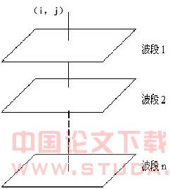 —第一系上新统葡萄沟组,橙黄色粉砂质泥岩; —下泥盆统卓木巴斯套组第二亚组硅化英安质凝灰岩; —下泥盆统卓木巴斯套组第二亚组英安质凝灰岩; —下泥盆统卓木巴斯套组第二亚组安质凝灰岩; —下泥盆统卓木巴斯套组第二亚组玄武质晶屑凝灰岩; —下泥盆统卓木巴斯套组第二亚组泥灰质结晶灰岩; —华力西中期第二侵入次花岗岩; —华力西中期第二侵入次石英闪长岩; —华力西中期第二侵入次闪长岩; —华力西中期第二侵入次闪长玢岩 βμ—辉绿玢岩;δμ—中性岩;συ—安山玢岩; —。斜长细晶岩;。q—石英脉;1—扭曲带;2—遥感预测靶区;3—蚀变带;4—遥感影象范围;5—金矿带编号;6—断层。 区内岩浆岩岩石类型按产状可分为两大类:即中——深层侵入岩,浅成超浅成侵入岩。中——深成侵入岩,第一次侵入岩规模小,分布零星,以辉长岩、闪长岩为代表;第二次侵入岩规模较大,分布较广,以石英闪长岩,花岗闪长岩为代表;第三次侵入岩规模较小,主要分布在区域东南部,以花岗岩为代表。浅成——超浅成侵入岩,以岩体规模小、出露零星为特点,岩石类型主要有辉绿(玢)岩、闪长玢岩、斜长细晶岩和花岗斑岩等,见图1。 虽然前人的工作表明该区具有良好的找矿前景,但只是属于基于1:5万比例尺的找矿预测成果,而深入开展矿产地质详查需要1:5000比例尺(甚至更大)的精定位地质资料。因此,仅凭已有地质资料无法对“九五” 期间提出的金矿蚀变带开展进一步深入的详查工作,也无法对外围地区的找矿远景作出预测评价。为尽快查明本区金矿产资源的分布,有必要采用更能够适合于该区开展深入找矿的有效技术方法。但这里人烟稀少,气候恶劣,在资金有限的情况下,开展任何面积性的矿产地质详查工作都不是一件容易的事情。为此,决定采用21世纪初期最先进的高分辨率卫星遥感技术,通过模式识别,开展大比例尺精定位遥感找矿勘查。为下一步找矿提供依据。 3 遥感图象分类的原理 遥感图象分类(Classification)是将图象的所有像元按其性质分为若干个类别的技术过程。多光谱遥感图象分类是以每个像元的多光谱矢量数据为基础进行的,如图2,假设多光谱图象由n个波段,则(i,j)位置的像元在每个波段上的灰度值可以构成一个矢量,X= 称作维为像元的亮度值,包含X的n维空间称为特征空间,这样n个波段的多光谱图象并可以用n维特征空间中的一点来表示。遥感图象的分类问题,分类图象中的某一类目标称为模式,而把属于该类中的像素称为样本,多光谱矢量X= 称为样本的观测值。