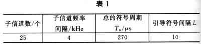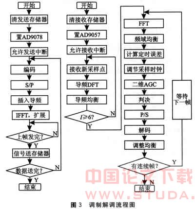 2.3 RS一232接口单元 用户数据接口采用RS一232标准串行口。串口的数据中断采用边沿触发中断,串口中断程序完成用户数据的发送与接收。将接收到的用户数据暂存到CPU的发送缓冲区中,等到满一个突发包时就发送到DSP进行处理。 3 参数设计 3.1保护时间的选择 根据OFDM信号设计准则,首先选择适当的保护时间,△=20μs,这能够充分满足在电力系统环境下,OFDM信号消除多径时延扩展的目的。 3.2符号周期的选择 T>200 μs,相应子信道间隔,f<5kHz,这样在25kHz带宽内至少要划分出5个子信道。另外子信道数不能太多,增加子信道数虽然可以提高频谱传输效率,但是DSP器件的复杂度也将增加,成本上升,同时还将受到信道时间选择性衰落的严重影响。因此,考虑在25kHz的带宽内采用7个子信道。 3. 3子信道数的计算 子信道间隔: ![]() 各子信道的符号周期:T=250μs 考虑保护时间:△=20μs,则有Ts=T+△=270μs 各子信道实际的符号率: ![]() 总的比特率:3.71kbps×25子信道×2b/symbol=185.5kb/s 系统的频谱效率:β=185.5kbps/100kHz=1.855bps/Hz<2bps/Hz 可以看出,这时系统已经具有较高的频谱效率。25路话音信号总的速率与经串并变换和4PSK映射后的各子信道上有用信息的符号率相比,每个子信道还可以插入冗余信息用于同步、载波参数、帧保护和用户信息等。需要指出的是: ①由于OFDM信号时频正交性的限制条件,在此设计中尽管采用了25个子载波并行传输也只能传25路语音。如果要传8路语音,经串并转换和16QAM映射后,各个子信道上有用信息的符号率为1.855bps/Hz,最多还可以插入的冗余信息为O.145bps/Hz,在实际传输中这是很难保证的传输质量的,因此该设计相对于M-16QAM采用4个子载波传输6路话音并不矛盾。 ②在此设计中,为冗余信息预留了较多的位,其冗余信息与有用信息的比值为0.59,大于iDEN系统的0.44。这是考虑到OFDM信号对于载波相位偏差和定时偏差都较为敏感,这样就可以插入较多的参考信号以快速实现载波相位的锁定、跟踪及位同步;另一方面对引导符号间隔的选择也较为灵活,在设计中选择引导符号间隔L=10。 ③OFDM信号调制解调的核心是DFT/IDFT算法。目前,普遍采用DSP芯片完成DFT/IDFT,因此有必要对设计所需的DSP性能进行估计。根据设计要求,至少要能在250μs内完成32个复数点的FFT运算。我们知道,N个复数点的FFT共需要2Nlog2 N次实数乘法和3Nl0g2 N次实数加法。假设实数乘法和实数加法都是单周期指令,以32个复数点为例,这样共需要800个指令周期,即20μs,因此采用TMS320VC5402能够满足设计要求(TMS320VC5402的单指令周期为10ns)。 综上所述,OFDM数传设备参数如表l所列。 ![]() 4 软件构成 上面确定了OFDM数传设备的主要参数及算法,下面说明用TMS320VC5402实现的软件设计及流程,如图3所示。 ![]() 4. 1 调制部分的软件设计 此程序作为子程序被调用之前,要发送的数据已经被装入数据存储器,并将数据区的首地址及长度作为入口参数传递给子程序。程序执行时,首先清发送存储器,然后配置AD9708的采样速率,之后允许串行口发送中断产生,使中断服务程序自动依次读取发送存储器中的内容,送入AD9708变换成模拟信号。之后程序从数据存储器读取一帧数据,经编码,并行放入IFFT工作区的相应位置,插入导频符号并将不用的点补零。随后进行IFFT,IFFT算法采用常用的时域抽点算法DIT,蝶形运算所需的WN可查N=512字的定点三角函数表得到。由于TMS320VC5402的数值计算为16位字长定点运算方式,所以IFFT采用成组定点法,既提高了运算精度又保证了运算速度。然后对IFFT变换后的结果扩展加窗,并将本帧信号的前扩展部分同上帧信号的后扩展部分相加,加窗所需窗函数可查表得到。窗函数存放在窗函数表中,是事先利用C语言浮点运算并将结果转换为定点数存放在表中的。 经实测,从读取串行数据到加窗工作完成最多占用75个抽样周期(75×125μs)的时间,而发送一帧信号需512+32=544个抽样周期(544×125μs)。这说明C5402的运算速度足够满足需要。 当上一帧信号发送完毕,程序立即将以处理好的本帧信号送入发送存储器继续发送,并通过入口参数判断数据是否发送完毕。 4. 2 解调部分的软件设计 用TMS320VC5402实现的流程分同步捕捉及解调两个阶段。同步捕捉阶段执行时,首先清接收存储器,配置AD9057的采样速率,然后开串行口接收中断,使接收中断服务程序接收来自AD9057的采样数据并依次自动存入接收存储器。 每得到一个新的样点,程序先用DFT的递推算法解调出25路导频符号,并对导频均衡。之后分别同参考导频符号矢量600h+j600h进行点积,这里用导频符号矢量的实部与虚部的和代替点积,即可反映相关函数的规律,以简化运算。求得25路导频与参考导频的相关值后暂时保存,并分别与前一个样点所保存的各导频相关值比较(相减),用一个字节保存比较结果的正负号(每路导频占1bit)。在处理前一个样点的过程中,也用一个字节保存它同其前一样点的导频相关值比较的正负号。对这两个字节进行简单的逻辑运算,即可判断出各导频是否在前一个样点处出现峰值。倘若25路导频中有20个以上的导频同时出现峰值,则认为该样点以前的N=512个样点即为捕捉到的一帧信号,程序进入解调阶段;否则等待接收新的采样点继续进行同步捕捉。 解调阶段首先对捕捉到的帧信号进行实信号的FFT变换,仍然采用成组定点法,之后进行均衡。然后利用导频算出本地抽样时钟的延迟τ,在计