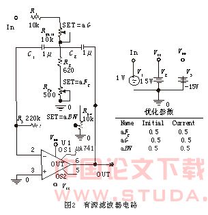 3.3 电路优化设计实例 滤波器电路如图2所示。优化目标要求中心频率(Fc)为10Hz;3dB带宽(BW)为1Hz,容差为10%;增益(G)为10,容差为10%。