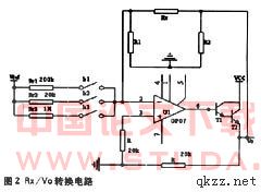 Rx/V0转换电路 Rx/v0转换的原理图如图2所示,图中Rx为待测电阻,R1和R2为Rx两端旁路的等效电阻,VREE为基准电压,R1~R3为基准电阻。由开关K来选择不同的量程。现以K1闭合为例:由图可得: