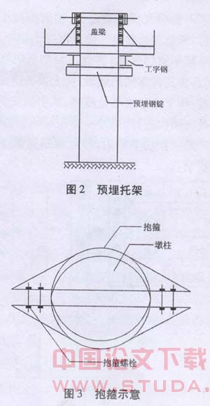 埋设托架式,即墩柱上预留水平孔,待墩柱混凝土拆模并有一定的强度后,向预留孔中穿人钢锭,然后利用钢锭两端悬臂部分搭设支架并铺设模板,如图2。