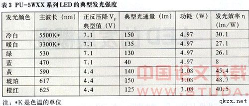 发光二极管(LED)是一种电致发光的光电器件。早在19今年开始,人们就发现某些半导体材料制成的二极管在正向导通时有发光的物理现象,但生产出有一定发光效率的红光LED已是1969年了。到今天,LED已生产了30多年,回顾过去,它已茁壮成长。各种类型的LED、利用LED作二次开发的产品及与LED配套的产品(如白光LED驱动器)发展迅速,新产品不断上市,已发展成不少新型产业。展望将来,还期望更进一步地提高。 早期的LED主要用于做指示灯。它的发光强度不高,一般小于1mcd,高的也仅几个mcd;另外,发光效率也不高,一般小于0.21m/W,其功率仅几十mW到上百个mW(属于小功率LED)。本文就从发光强度提高说起。 发光强度及发光效率的提高 作为指示灯方面的应用,有几个mcd的发光强度也可以了,但由LED组成的数码管或字符管则显得亮度不足,若要用于户外作信号或标志显示,则其亮度太低,不能满足使用的要求。所以LED的主要发展方向是提高发光强度(也就是一般所指的提高亮度)。 随着半导体材料及半导体工艺技术、设备的发展,LED的亮度不断提高,开发出高亮度及超高亮度LED,并且不断创造新记录。 笔者用现有的LED资料,以中5标准封装、发红光、视角差不多的LED为例,以不同的生产年份的发光强度来说明LED发光强度提高的情况,如表1所示。 从表1可以看出,近30年LED的发光强度提高了8000倍左右。1969~1987年LED的发光强度是很低的,发展很慢,但1994~今年LED的亮度有很大的发展。表1中列出的并非发光强度最高的。例如,在GaAs的衬低上采用AIlnGaP工艺技术制成的Φ5、红光LED,在小视角4°、50mA工作电流时,其典型发光强度为20000mcd。 LED另一个重要性能指标是发光效率η,用1m/W来表达。各年份生产的LED发光效率如表2所示。 从表2可以看出,这30多年来,LED的发光效率提高了250倍以上。1970-1990年LED发光效率提高较慢,1990-今年则提高较快。例如,Cree公司生产的lW白光LED XL7090WHT,其发光效率可达601m/W。 XL7090WHT是超高亮度、小尺寸封装的白光LED。XL7090WHT的发光强度大,电流350mA时的典型光通量为601m,在瞬态脉冲电流700mA时典型光通量可达981m,而目前一般1W白光LED的光通量为30~45lm),XL7090WHT的发光效率高达601m/W,视角宽达100°,封装尺寸仅为9mmx7mmx4.3mm,工作温度范围是-20~+80℃。 由于XL7090WHT发光强度大、发光效率高,因此它适用于家庭、商业或公共场所明、DVD、笔记本电脑、电视机的彩色显示屏的背光,广告灯、路灯及标志灯,汽车及运输工具的内外照明及数码相机的闪光灯等。 从表1和表2也可以看出,LED的发光强度及发光效率的提高主要取决于采用的半导体材料及其工艺技术的发展。早期的LED主要用GaAs、GaP(二元素半导体材料)和GaAsP(三元素半导体材料),1994年左右采用AIInGaP(四元素半导体材料)后,其发光强度及发光效率有很大的提高。另外,在工艺技术上采用在GaAs衬底上用AilnGaP材料生产的红光、黄光LED及在SiC衬底上用InGaN材料生产的绿光、蓝光LED,在发光强度及发光效率上有较大的改进。 LED的功率提高 我们知道LED的发光强度与正向电流IF,几乎成线性关系,即增加正向电流IF可增加发光强度。但LED有一个最大功耗PD值的限制,PD=VFxIF(VF为正向压降),若过大地增加IF而使PD超过最大值时,LED会过热而损坏。为了要提高发光强度,开发出中功率LED(一般为几百mW),其工作电流也提高到70mA。近年来,为进一步提高发光强度,开发出大功率LED,其功率一般为1~10W(有一些还大于10W)。它的工作电流一般为350~700mA,有些可达1A以上。 以American Opto Plus LED公司生产的5W的PU-5WXX系列为例,在700mA电流下,其结温了Tj为25℃,其典型发光强度如表3所示(大功率LED的发光强度用光通量表示)。
