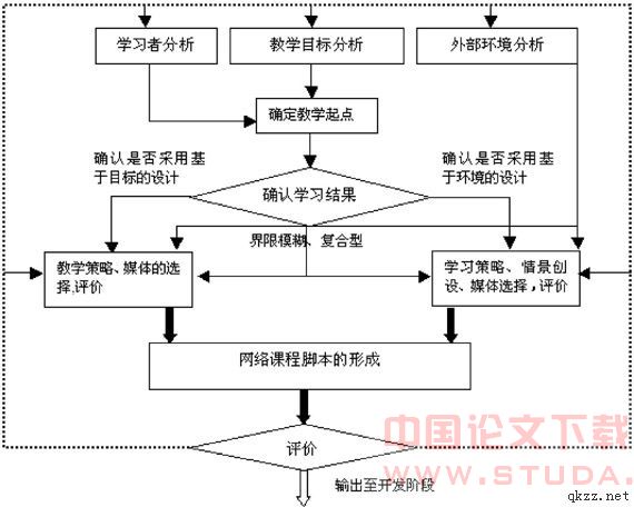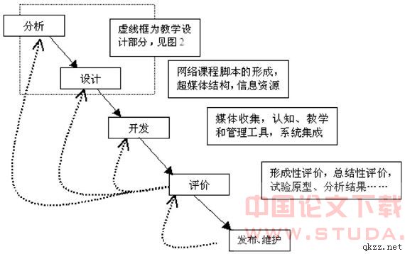 摘要:本文运用教学系统设计的方法,结合目前国内外网络课程开发的实践,提出了网络课程开发的一般步骤,包括设计、开发、评价、发布和维护四个环节。并结合技术特点和开发者实际情况,提出了基于专业人员和学科教师开发的两种模式。 关键词:网络教育;课程开发;教学设计;课程发布 网络教育是通过网络展示的教学内容及教学活动的总和。它包括两个组成部分:按一定的教学目标、教学策略组织起来的教学内容和网络教学支撑环境。其中网络教学支撑环境特指支持网络教学的工具软件、教学资源以及在网络教学平台上实施的教学活动。因此,网络课程与一般的多媒体教学软件或网络教学资源在使用环境、内容结构、功能作用等方面不同。由此可见,探索和研究网络课程的开发的有关理论和方法,具有重要的意义。 1 网络教育的构成 网络教育是学生利用网络进行远程学习的重要手段。根据网上教学的特点和人才培育的需要,网络教育课程由以下几个系统构成: (1)教学内容系统:包括课程简介、目标说明、教学计划、知识点、典型实例、多媒体素材等。 (2)虚拟实验系统:包括实验情景、交互操作、结果呈现、数据分析等。 (3)学生档案系统:包括学生密码、个人账号、个人特征资料、其他相关资料等。 (4)诊断评价系统:包括形成性练习、达标测验、阅卷批改、成绩显示、结果分析等。 (5)学习导航系统:包括内容检索、路径指引等。 (6)学习工具系统:包括字典、词典、资料库、电子笔记本等。 (7)协商交流系统:包括电子邮件、电子公告牌、聊天室、讨论室、教师信箱、问答天地、疑难解答等。 (8)开放的教学环境系统:包括相关内容、参考文献、资源、网址的提供等。 2 网络教育课程设计原则 网络教育课程的开发是在科学、系统、规范设计的基础上进行的,所以应该遵守以下一些原则: (1) 个性化 网络课程在设计时要突破简单的演示型教学模式,体现知识的建构过程。重视学生作为认知主体的作用,体现学生个性化学习的特点,为学生提供灵活多样的检索方式,提供学习必须的工具软件(如计算器、在线字典、电子记事本等),实现学习过程的自动记录功能等。 (2) 协作化 协作学习有利于高级认知能力及合作精神的培养。网络为网络课程的协作学习提供了环境平台,因此要发挥这一优势,为网络课程学习提供协作学习和协同工作的工具。 (3) 多媒体 随着网络技术的进步,Internet和Intranet向高宽带、高网速发展,使网络教育的多媒体传输成为可能。为提高学生的学习兴趣,应根据需要提供图文声像并茂的教学内容。 (4) 动态化 随着科学技术的迅速发展,知识老化的周期日益缩短。网络教学的动态更新特点使得课程内容能够跟上时代的步伐。为此,在设计网络教育时要遵循动态化设计原则,随时扩充新的知识内容,保证学科内容的先进性。 (5) 交互性 对于教学媒体来说,交互性的教育在于学生的参与性、主动性。网络教育中师生间必要的沟通交流显得尤为必要。网络为教师与学生、学生与学生之间的交互提供了得天独厚的条件。为此,在设计网络课程时,应该开辟出常见问答库、教师信箱和集中答疑等模块,实现教师与学生、学生与学生之间的交互。 (6) 共享性 网络教育最大的优势在于资源共享。为此,在设计网络课程时要体现共享性的设计原则。对于重要知识点的学习,通过链接、提供网址资源等多种方式引入丰富的动态学习资源,提高网络课程结构的开放性,体现网络资源共享的优势。 3网络课程开发的一般步骤 网络课程开发的一般步骤如图1所示。它由四个步骤组成:第一阶段为教学设计阶段,包括分析和设计两个子过程。第二阶段为开发阶段。第三阶段为评价阶段。第四阶段为发布阶段。无论哪一种形式的课程开发模式,实质都是系统方法的具体应用,所以它们的框架大同小异,只是在具体设计过程、实际操作步骤中所体现出的设计理念、设计原则不同而已。 图1 网络课程开发步聚 图2 网络课程教学模式设计 (1) 教学设计 网络课程开发过程(如图2所示)中,教学设计的结果是网络课程开发的蓝图,直接决定了整个网络课程的优劣。依据网络课程设计的指导思想和原则,要求在教学设计阶段,以一种介于基于目标的教学设计和基于环境的教学设计的混合模式来设计网络课程,以期优化教学环境,达到最好的教学或学习效果。