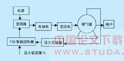 4 恒压供气控制方案的设计 针对原有供气控制方式存在的诸多问题,经过上述对比分析,本人认为可应用变频调速技术进行恒压供气控制。采用这一方案时,我们可以把管网压力作为控制对象,压力变送器YB将储气罐的压力P转变为电信号送给PID智能调节器,与压力设定值P0作比较,并根据差值的大小按既定的PID控制模式进行运算,产生控制信号送变频调速器VVVF,通过变频器控制电机的工作频率与转速,从而使实际压力P始终接近设定压力P0。同时,该方案可增加工频与变频切换功能,并保留原有的控制和保护系统,另外,采用该方案后,空压机电机从静止到旋转工作可由变频器来启动,实现了软启动,避免了启动冲击电流和启动给空压机带来的机械冲击。 具体的控制系统流程图如图1所示。