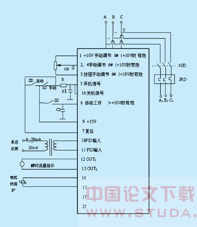 图3中几个接口功能简单说明如下:(5、6、7、16、等接口的功能,可通过对变频器设定参数来定义) 5-开机信号 >+10V 时有效控制; 6-自动工作信号 >+10V 时有效, <+10V 时手动调节有效; 7-复位信号 >+10V ↑上升沿时有效; 16-停机信号 <+10V 时有效。