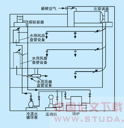 工作原理:采用设备中的风扇使室内空气循环,并通过设备中的冷、温水盘管来冷却和加热,以达到空调的目的。盘管中的冷、温水由机房中的制冷设备和锅炉提供。 该系统的缺点是:设备配置较大,风机噪音大。当环境温度变化或冷、热负荷变化时,只能通过增减冷、温水循环泵数量或使用挡风板的方法来调节室内温度,既耗费能源又造成环境温度波动。