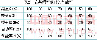 (2) 几种典型负载与节能关系 由于中央空调系统中都是各种风机、泵类负载,根据流体学原理可知,P}n3,故应用变频器后,节能效果显著。表2列出风机、泵类负载应用变频器后,在不同流量Q、转速n、由功率P(额定值的相对百分数)在某频率值时的节能率。