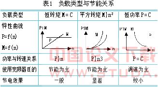 3 负载与节能关系 (1) 负载类型与节能关系,生产机械各式各样,种类繁多,但负载类型主要分3类,它们与节能的关系见表1