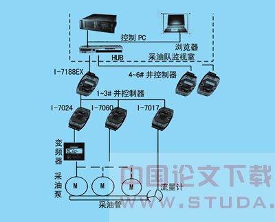 由于下庄采油队有12台抽油机,为便于“集中管理、分布式控制”,在小队的控制室安装有一台监视控制计算机,主要用来管理I-7188EX,并且实时记录流量、工作日志、设备运行的健康状态。由于小队的控制室远离采油厂的采油统计中心,因此,巡视人员将定期携带移动式笔记本电脑通过HUB与控制计算机采用TCP/IP协议下载控制计算机的记录参数,然后回采油统计中心将各个采油分队的记录参数汇总,统计,达到了对采油设备工作状态参数的综合测试以及管理的目的。在图1所示的架构图中,I-7188EX与I-7000模块采用RS-485通信、I-7188EX与控制计算机采用TCP/IP通过HUB相连并通信。从而实现了分级控制、分级管理,利于维护、安装、移动和拆卸。是一种比较的采油设备控制系统。