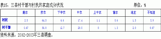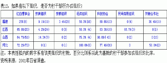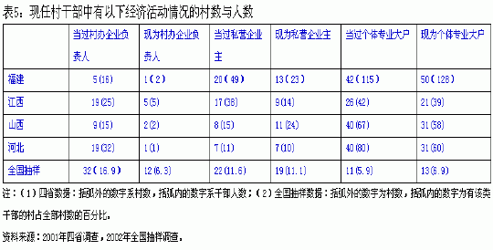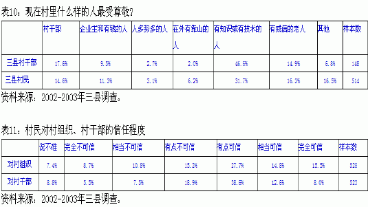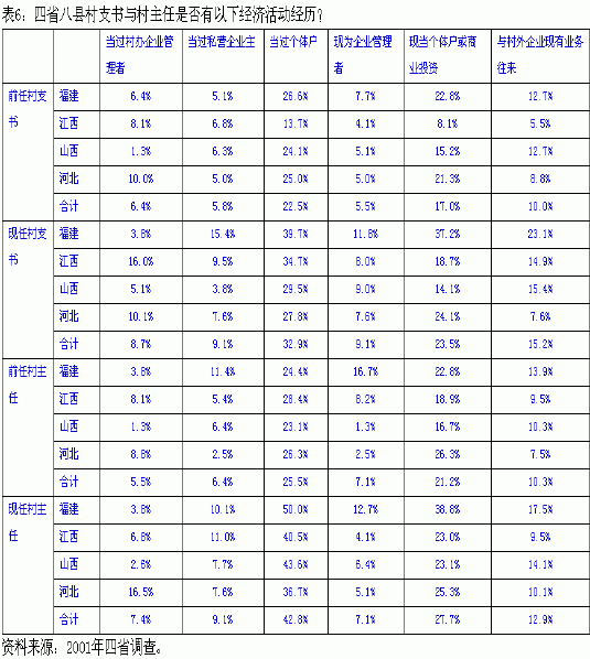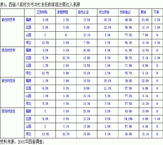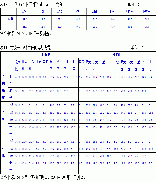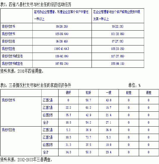 ![]() 而就村支书和村主任来说,如表6显示,拥有同类经济活动经历的比例要高于一般村干部。在村支书和村主任中,经济精英所占的比重要高些,尤其是当过或现当“个体专业大户或商业投资”的人数比例明显要高。 村支书和村主任的经济活动状况,在表7中有更直接的反映。笔者将担任过“村办企业管理者、私营企业主和个体户三种经历”之一的人合计起来,发现:这两类主要干部中曾是“经济精英”的比例在三成以上,现任村支书和村主任比其前任均提高了一成多,达到四成左右;而且,在316个村中,有近六成村的支书或主任曾是“经济精英”,比其前任增加了16个百分点。村支书和村主任在企业管理者、个体户和商业投资者中的兼职状况,如表7所示,现担任其中一种的人比例依然较高,在现任村支书和村主任中的比例达到三成以上,有近五成村的支书或主任兼任目前依然兼任“经济精英”。这些情况表明,村主要干部中“经济精英”的比重明显较高,而且,不管是“富人从政”还是“干部谋富(从事经济活动)”的现象,都在扩增之中。 ![]() ![]() ![]() 在调查中,我们还了解到村支书与村主任的家庭经济状况与主要收入来源。从表8中反映的三县调查数据看,与本村村民普遍的经济状况相比较,村支书和村主任的家庭经济条件普遍良好,多数好于普通村民,没有一人的家庭经济状况差于村内平均水准。 表9显示,在村支书和村主任自报的家庭主要收入来源中,“农林渔业”依然是多数人的收入来源之一,其次为“自办企业”和“外出劳务”的收入。 四、道德权威状况 与权力体现暴力和强制力不同,权威所内含更多的是民众发自内心的认同与服从,它体现着权力的合法性和正当性。在传统中国乡村,乡绅往往将“村治精英”与“道德权威”合为一体,不仅依凭权力、而且借助权威来治理着乡村地区。在当今农村,村干部的道德权威状况又如何呢? 在调查中,我们试图从“村里什么样的人最受尊敬”和“对村组织和村干部的信任度”这两个指标,测量村民对村干部权威的认同状况。从表10的调查数据可见,在村民所选择的最受尊敬的人中,“有知识或有技术的人”最多,其次为“有威信的老人”,再依次为“村干部”和“企业主和有钱的人”,在这里,村干部被列在第三位。村干部则将自我评估为第二位,与村民的评价有一定的距离。表11的数据反映,村民对村组织和村干部的信任程度并不高,表示“相当可信”或“完全可信”的村民在二至三成之间,多数村民的态度在“有点可信”和“有点不可信”之间。这表明,村干部与村组织在村民中的威信并不高,村干部在乡村已乏道德权威,其管理活动依靠的不是权威而是权力。 ![]() 五、社会组织资源 组织意味着权力。按政治社会学理论,组织能为政治人物提供有力的“集体政治资源”(丹尼斯。郎,2001:162)。在中国农村,村干部们的上任是否也与其所拥有的组织资源有关呢?在我们的调查中,对村干部组织或参与正式组织(如中国共产党、科技协会、供销合作组织、经济组织、宗教组织、红白理事会),以及非正式组织(如宗族组织、村庄组织)的情况,做了初步的了解。 从本文表3中所列村主任的“中共党员”身份看,多数人拥有此身份。但遗憾的是,在调查设计中未能考虑到村主任任职与加入中共组织的时序差,因而,无法区分出这样的情况:他们究竟是因党员身份而任村主任职,还是因出任村主任职而被发展入党?这种缺憾也表现在对村干部与其他非正式组织的关系的考察上,以致无法进一步分析村干部任职与这些组织资源之间的关系。表12所示,在四省316个村中,除了“红白理事会”和“科技协会”在山西和河北、“宗教组织”在福建较为常见外,其他的正式组织并不普及。在这些业已存在的组织中,由村干部所主办或组织的多为“红白理事会”、“经济组织”和“科技协会”,而“宗教组织”、“民间信用组织”和“供销合作组织”则多为非村干部所主办或组织。 ![]() 不过,对村庄、姓氏和宗族背景这类先赋性组织资源的调查,却让笔者能做进一步的分析。 先看村干部的村庄背景。在表2所列村支书和村主任“是否是本村人”中,除了个别人外,绝大多数村支书和村主任均系本村人。表13显示,在三县回答村庄背景的157个村干部(主要为村内三大头,即村支书、村主任和村会计)中,来自大村庄的村干部在江西C 、T 两县达到六成,在山西X 市虽只有三成多,但比来自小村庄的仍高出20个百分点。 次看村干部的姓氏背景。表13的数据表明,来自大姓的村干部,在江西C 、T 两县占到近七成,在山西X 市也达55.3%. 再看村干部的宗族背景。表13含三县157个村干部的宗族与房股背景,表14则有对全国241个村和三县54个村的支书和主任的宗族与房股背景资料。表内标示的宗族与房股大小之分,依据的是其人口在全村或本族内之比。从三县情况看,在表13反映的157个“村三大头”中,江西C 、T 两县来自大族者占近六成,但来自大房者却略少于来自小房者;山西X 市来自大族、大房者略低于来自小族、小房者。不过,从表14所列三县村支书和村主任的情况看,来自最大和次大宗族与房股的人员均占了多数或大多数。 从全国抽样调查的数据看,在前任村支书中,来自最大和次大族与房股的比例分别为43.5%和46.6%,而来自一般宗族和小族、一般房股和小房者分别为53.0%、49.