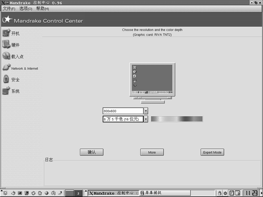图4 配置桌面分辨率和刷新频率 对于Linux桌面应用者,屏幕的分辨率和刷新频率是比较重要的,设置不当很容易让使用者的眼睛疲劳或损坏计算机的硬件。屏幕的分辨率和刷新频率由显示器和显示卡的性能共同决定。一般我们设定,17英寸显示器的分辨率为1024×768,刷新频率85Hz;15英寸显示器的分辨率为800×600,刷新频率85Hz。具体操作为:用鼠标点击“控制中心”的硬件选单的显示图标,打开配置显示,将分辨率设置为800×600,色深为1600万色(24位元),见图4所示。 4.配置声卡