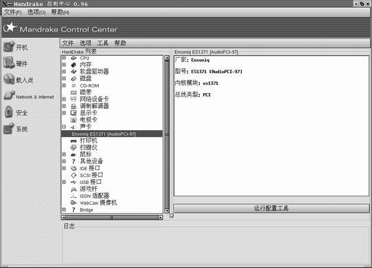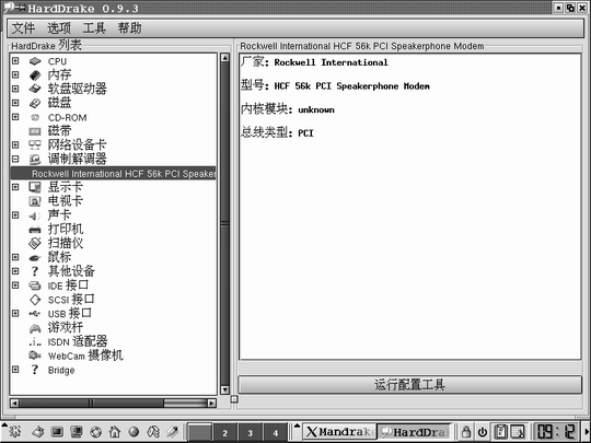 图5 配置声卡型号 在Linux“控制中心”硬件的主选单中没有声卡的选项,打开“Hardware List”可以看到所有的硬件列表,这和微软视窗操作系统中的“设备管理器”相似。用鼠标点击硬件列表的“声卡”选项,选择适合的声卡型号之后,点击“运行配置工具”按钮选择声卡主芯片型号,然后用鼠标点击“确定”按钮即可,见图5所示。从图5中可以看到笔者声卡的详细情况:声卡型号是ES1371,总线类型是PCI。 5.配置调制解调器