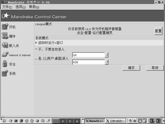 图2 计算机系统的核心信息 2.配置开机模式和系统模式 用鼠标单击“开机”图标,见图3所示。这里可以选择用Grub或是LILO作为开机程序管理器。对于Linux的初学者来说,使用LILO启动还是比较安全的。当对Linux比较熟悉以后,Grub(Grub比LILO功能强大,但是配置也较复杂)是一个不错的选择。除了设定开机程序管理器,还要设定系统模式,包括是否直接进入X窗口和使用什么桌面环境。我建议初学者使用KDE环境,因为与GNOME环境相比,KDE配置环境比较简单。配置结束后用鼠标单击“确定”按钮返回“控制中心”。