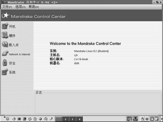 图1 Mandrake 8.2 Linux 的KDE桌面环境 配置硬件 进入Mandrake 8.2 Linux 的KDE桌面环境后,需要进一步配置硬件。在安装Linux时虽然有一些缺省配置,但这远远不够,还需设置桌面分辨率、刷新频率、声卡、调制解调器和打印机等。需要说明的是,所有硬件配置都必须获得根权限。 1.浏览系统信息 单击桌面图标“配置中心”,在这里可以看到一些系统信息:软件版本、内核版本、主机名称、中央处理器型号等内容。例如,笔者机器的信息是:软件版本为Mandrake 8.2 Linux(Bluebird),主机名称是cjh、核心版本为2.4.18-6mdk、机器名为i686,见图2所示。