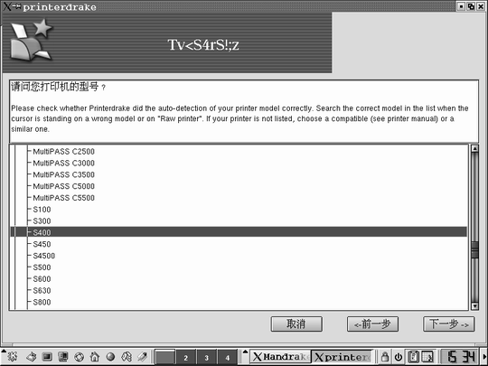 图8 选择打印机型号 (4)进行打印测试。检测打印机是否正常工作,对于普通打印应用选择标准测试。在“标准测试页”选项前打钩,然后按“下一步”按钮继续。 (5)完成配置。如果打印测试正常,选择“完成”按钮退出配置,否则按“前一步”按钮回去重新检查配置。 7.配置扫描仪 用鼠标单击“控制中心”硬件选单的“Scanner”图标,和配置打印机相似,系统会要求光盘驱动器插入第一张安装盘。接着选择要配置的扫描仪的生产商和具体型号,见图9所示,然后按“确定”按钮。如果出现一个“恭喜”的界面就表示配置成功。