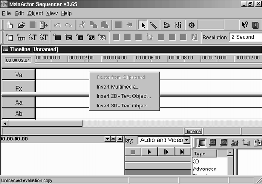 图4 功能强大的多媒体编辑器 (1)主选单和快捷按钮,主选单包括File、Edit、Object、View和Help五个子选单选项。 (2)主选单下面是一组工具栏,主要包括向时间轴添加图像、字体、颜色、视频、声音、不规则图形等。 (3)多媒体文件预览窗口,在保存文件前请预览该文件。 (4)时间轴(Timeline)将时间分割成许多同样的小块,每一块表示一帧。时间轴上的每一小格就表示一帧,帧由左向右按顺序播放就形成了动画电影。时间轴是安排并控制帧的排列及将复杂动作组合起来的窗口。 (5)二维和三维符号浏览器。 (6)时间轴播放控制器。 下面举一个实例: ◆ 在时间轴内点击鼠标右键,选择第三项向时间轴加入2D字符,见图5所示。