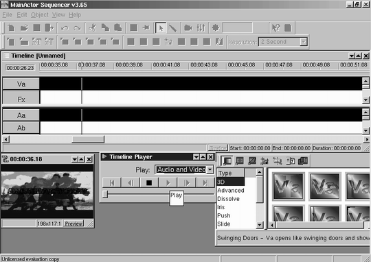 图6 时间轴内振荡符号的预览 ◆ 在时间轴内的下一帧点击鼠标右键,选择第二项向时间轴加入多媒体文件。 ◆ 选择音频、视频、图像格式文件的互相转换工具mave,以生成MPEG-1文件。 ◆ 预览刚刚生成的新文件,点击时间轴播放器(Timeline Player)的“Play”,见图7所示。